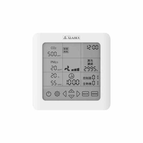 1.觸控式控制器,可APP智慧預約、遠端操控,偵測CO2濃度、PM2.5濃度、環境溫度、環境濕度。依照設定條件,自動控制換氣設備進行多種換氣模式。